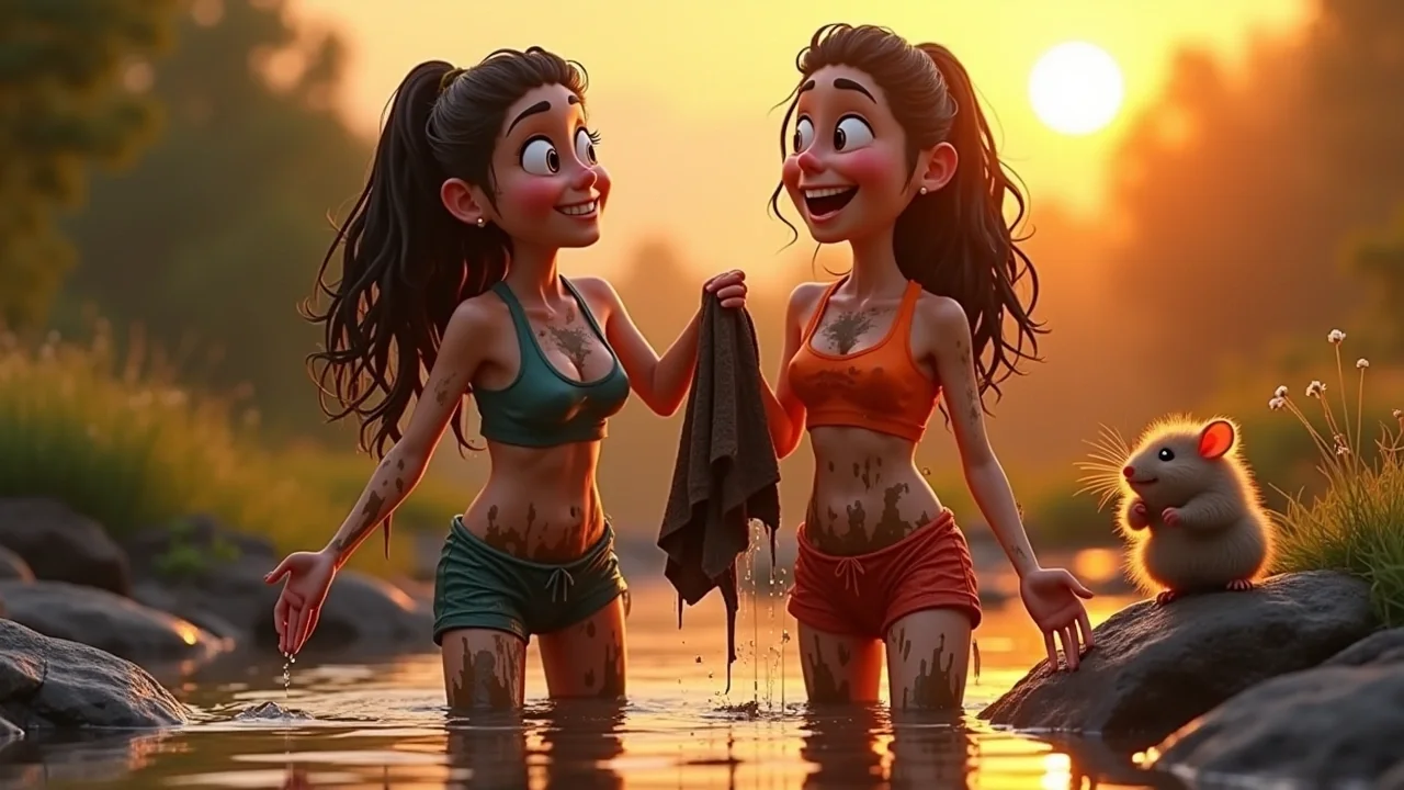 Efter en stunds gemensamt arbete, där de skrubbade och sköljde, började Erica äntligen se ut som sig själv igen. Hennes kläder var fortfarande fläckiga, men leran var borta. De satt vid bäcken, trötta men glada, och tittade på solnedgången.