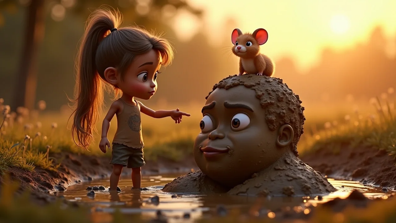 Erica skrattade så att magen skakade. ”Och du ser ut som en som har försökt fånga en!” svarade hon, och slängde en liten lerklump på honom. Den träffade mitt i pannan med ett mjukt *plask*.